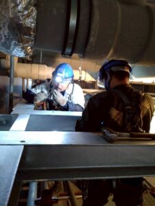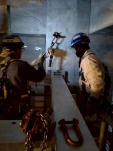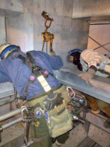 建屋と足場の狭い隙間から鉄骨を荷揚げし横持ちして取付まとめました。